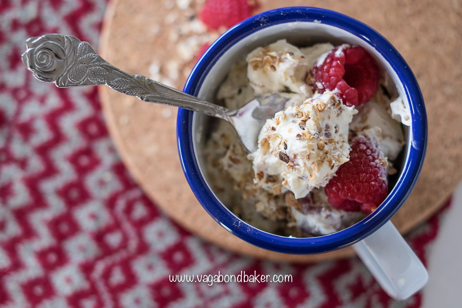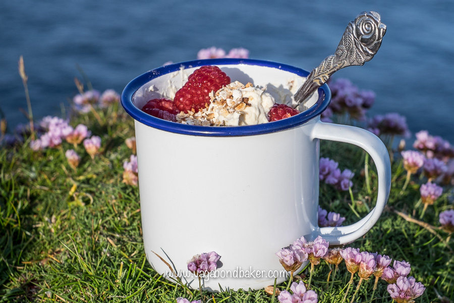 Share the mixture between two serving glasses, or cups if you live in a camper van! Decorate each with a couple of raspberries and sprinkle over a little of the reserved toasted oats just before serving.