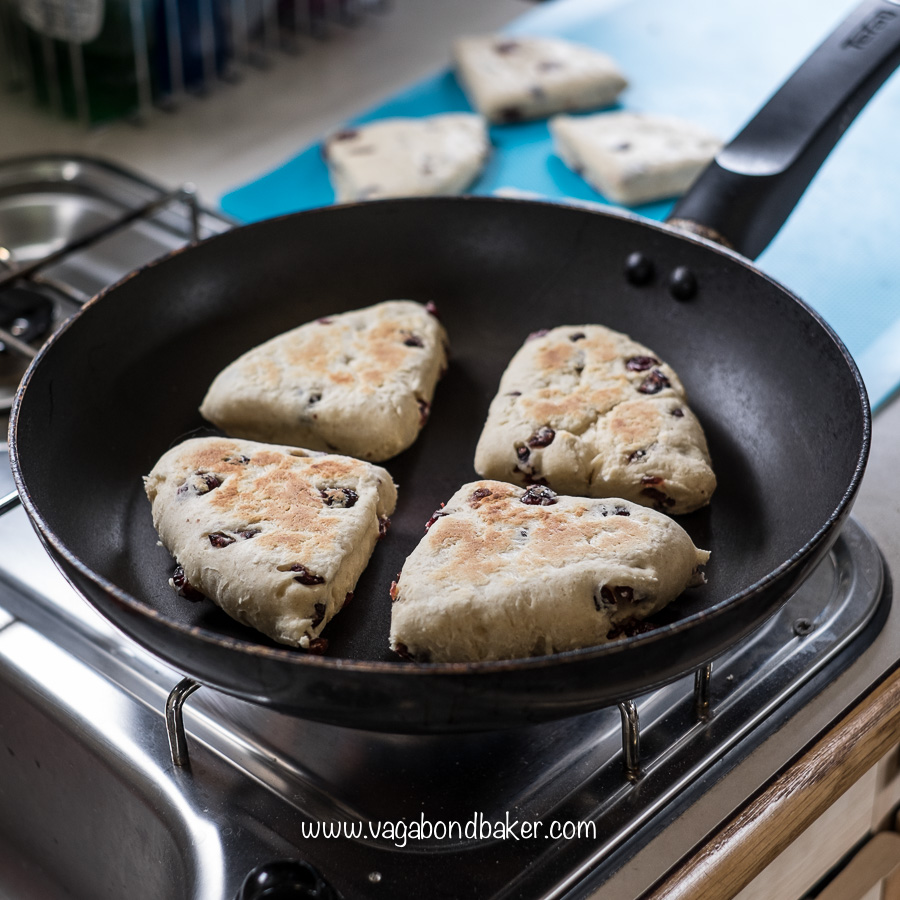 Heat a dry drying pan over a low to medium heat. Cook the bannocks without oil for a few minutes on each side. Keep the heat low to prevent them burning and to cook the insides.