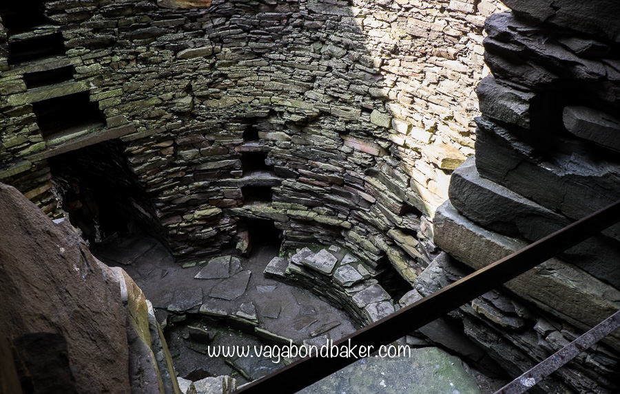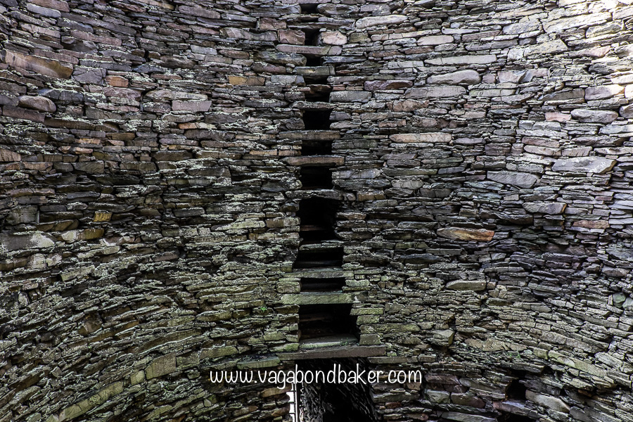 I stooped to go through the low door into the broch, closing it behind me. The dark interior became light as my eyes adjusted, lit from up high as the broch has no roof. Dark niches in the broch floor tempt a torch for your curiosity and stepping up onto a stone platform an arch leads to the ancient stairs that wind up the inner walls.