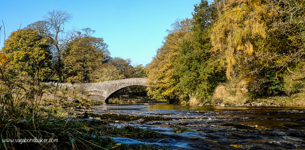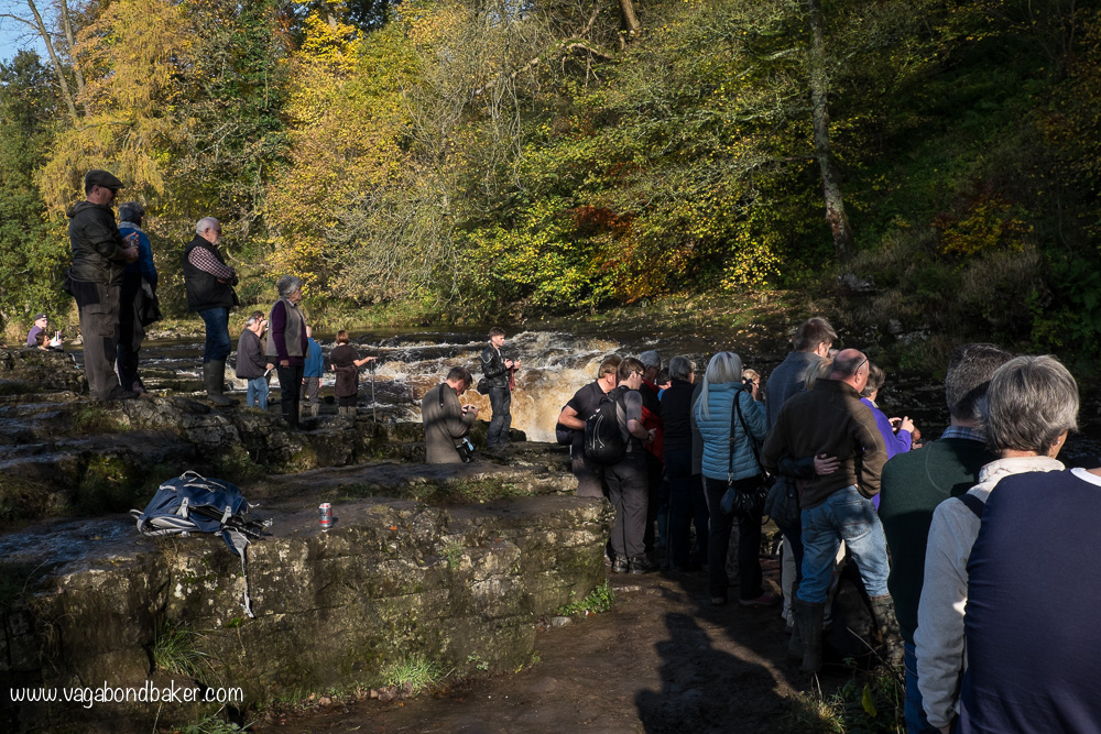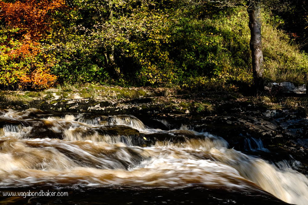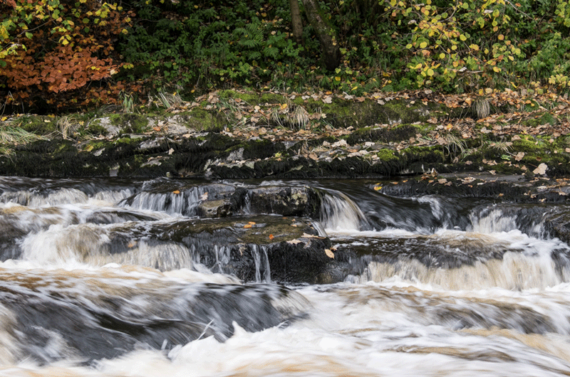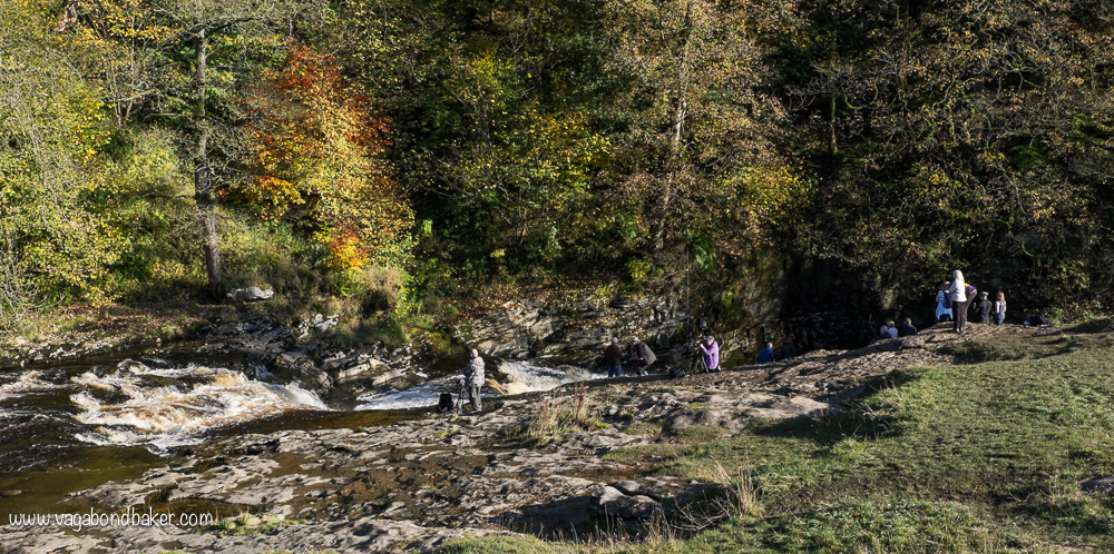 The River Ribble tumbles over a series of three low waterfalls into deep tea-coloured pools, beautiful at any time of year but particularly lovely with the hues of autumn trees and the excitement of the salmon run.