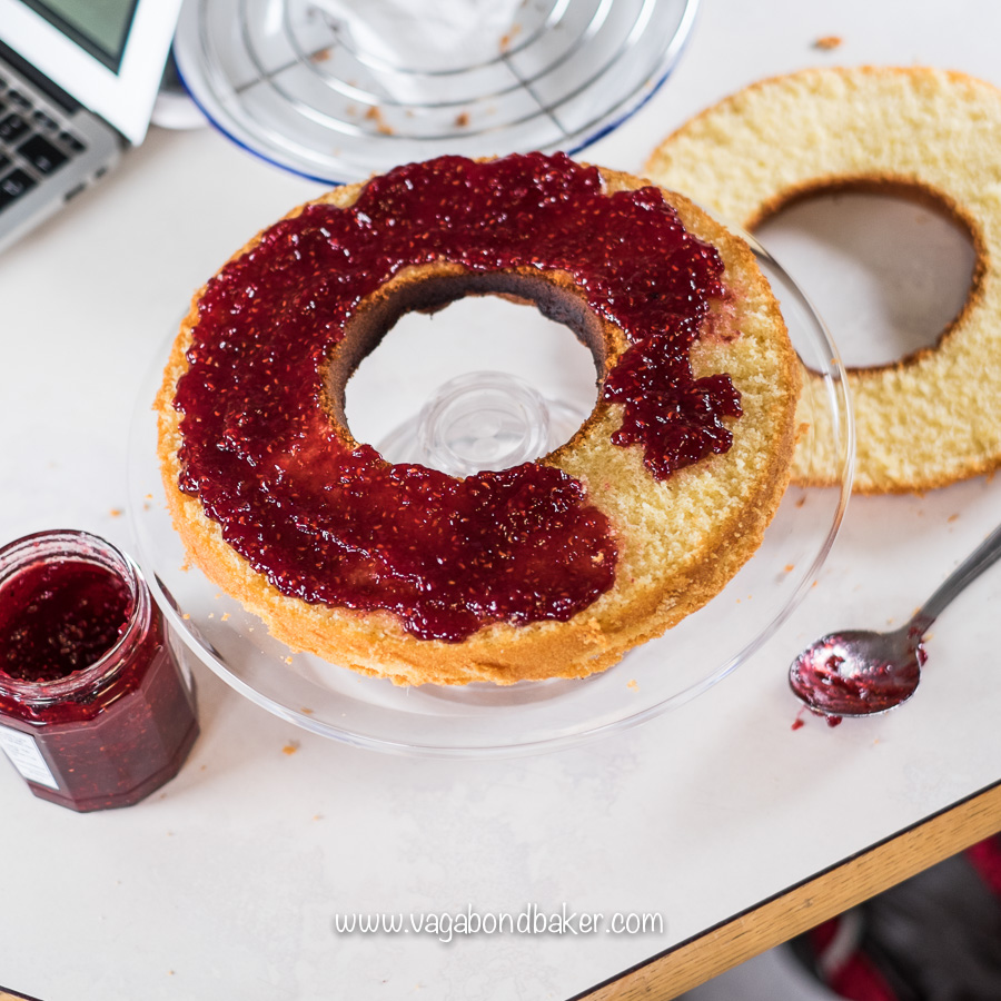 Once the cake has cooled take a sharp knife and slice the cake in half to make two rings of sponge.