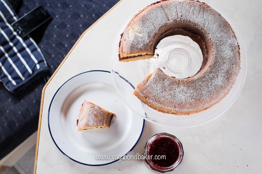 I didn’t help matters by not placing the circular ring pan onto the steel base plate properly and the cake came out lopsided: more risen on one side than the other.