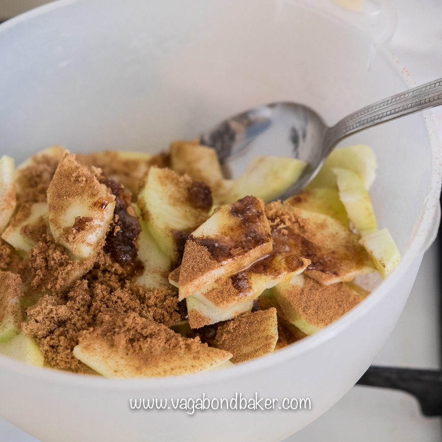 - Carefully combine the apple slices with two tablespoons of the melted butter, two tablespoons of the muscovado sugar and the half teaspoon of cinnamon. Set aside.