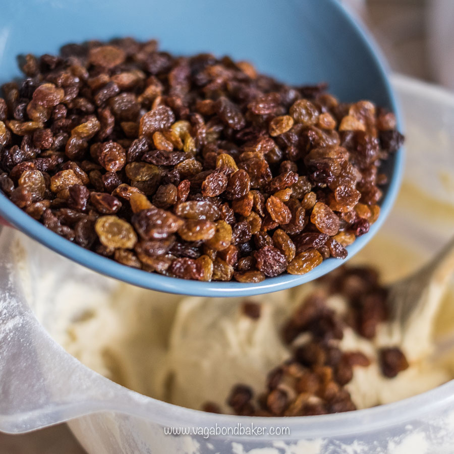 Stir in the sultanas to distribute evenly throughout the batter.