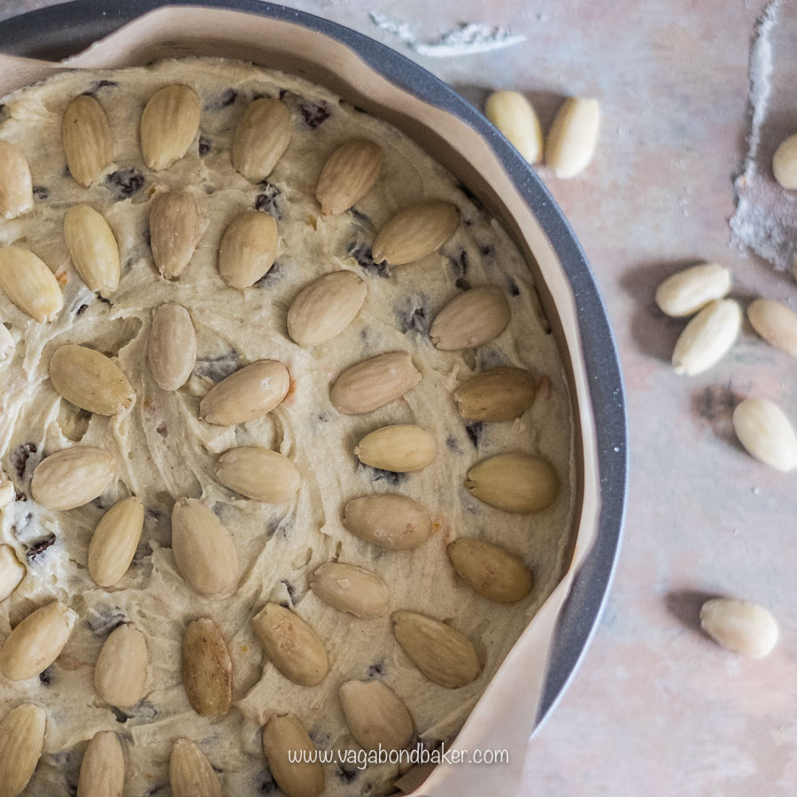 - Make rings around the top of the cake with the whole blanched almonds, placing them lightly.