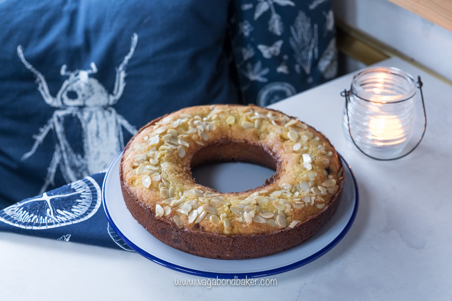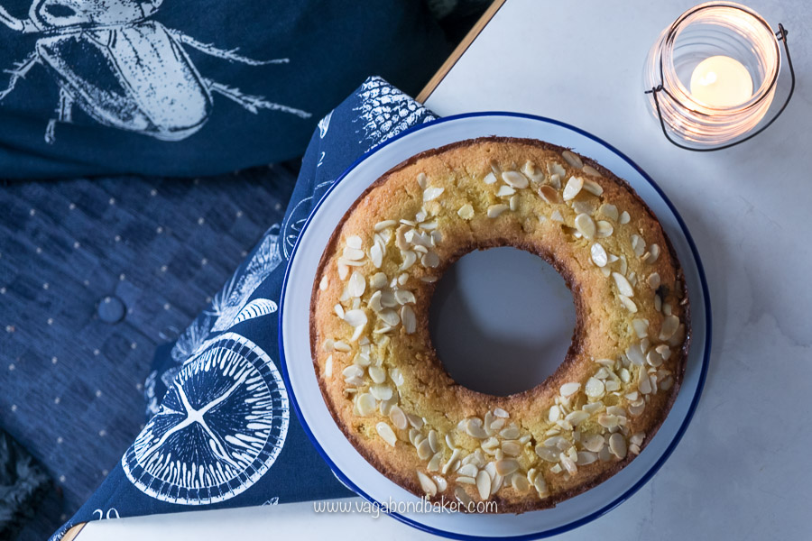 Allow the cake to cool completely in the pan, then turn out – this is easy if you used a springform pan. This is tricky if you used an Omnia oven, because you want the flaked almonds to be on top of the cake.