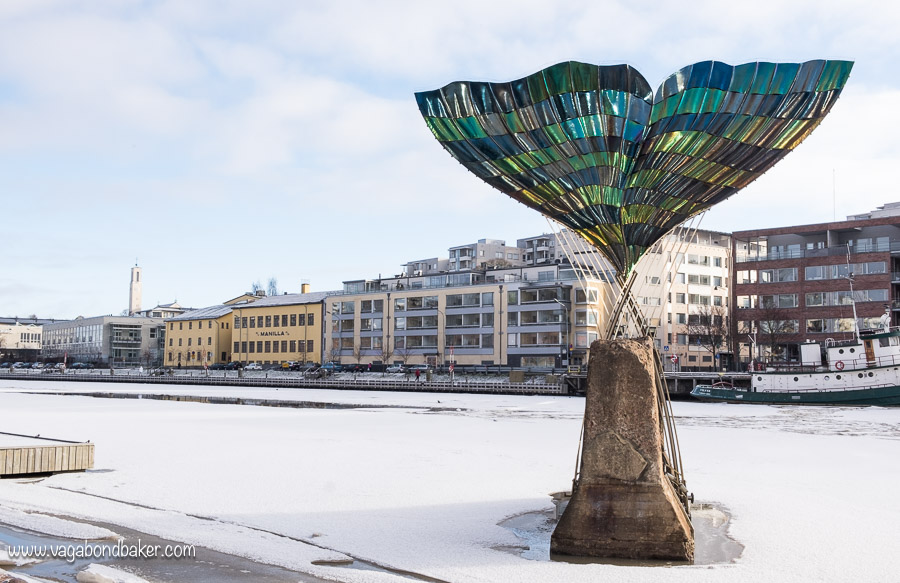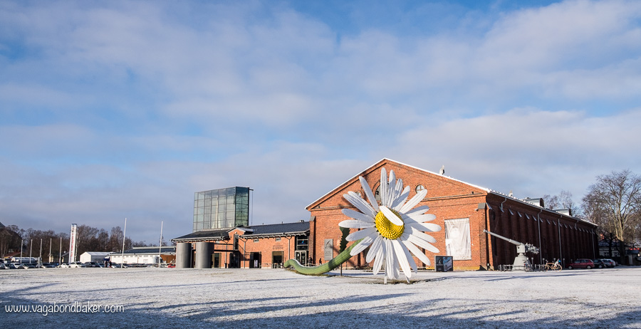 You first pass the MS Bore and the gleaming white Suomen Joutsen (Swan of Finland) frigate ship, both are museum ships connected to the Forum Marinum (the Suomen Joutsen can only be visited in the summer) and there is a wonderful Daisy sculpture in front of the forum too. (the droopy petal was fixed in the summer!).
